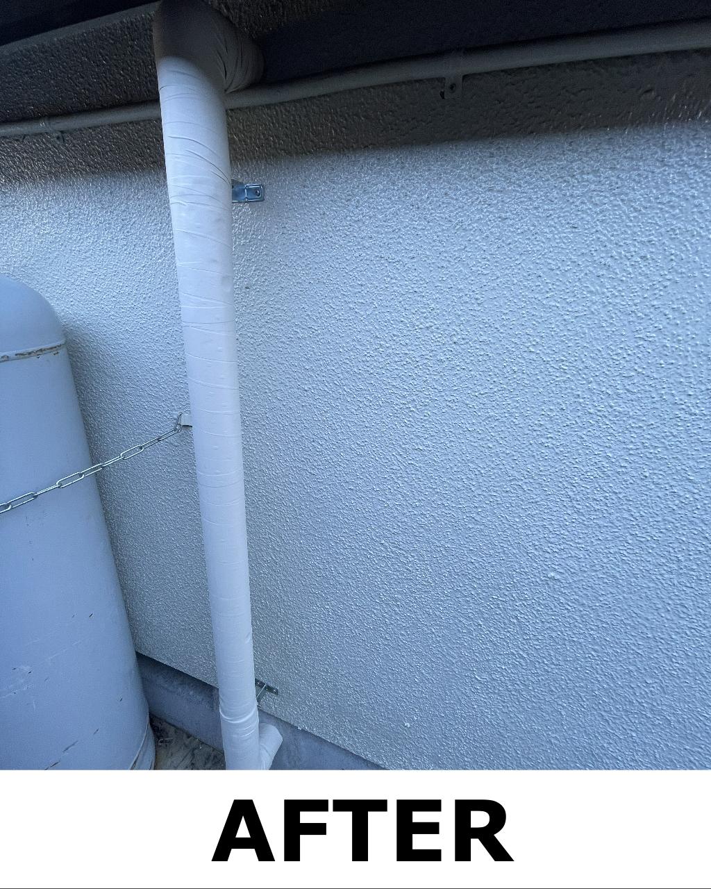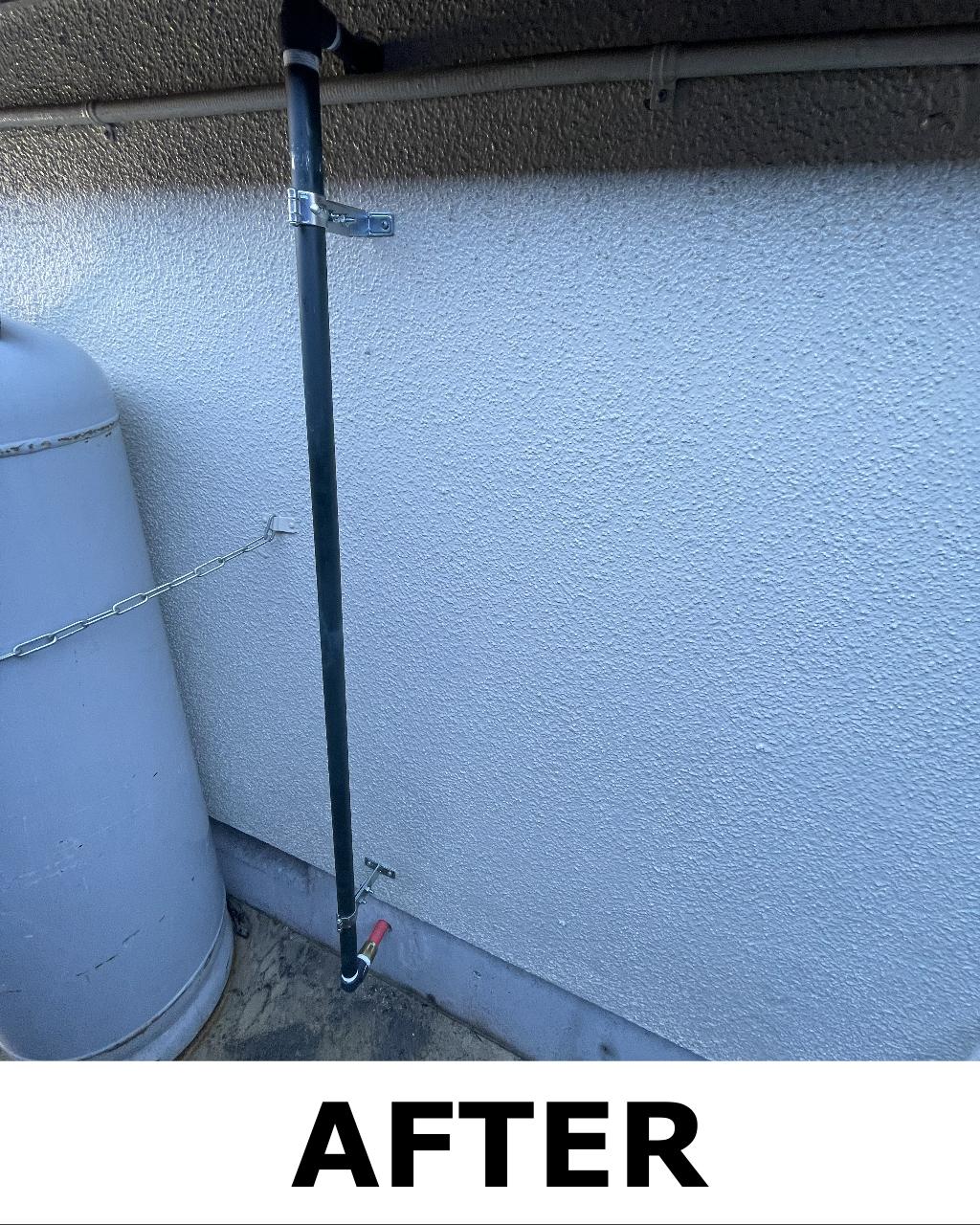 壁の中で漏水していたため穴を開け外壁露出による新規配管で対応させていただきました |