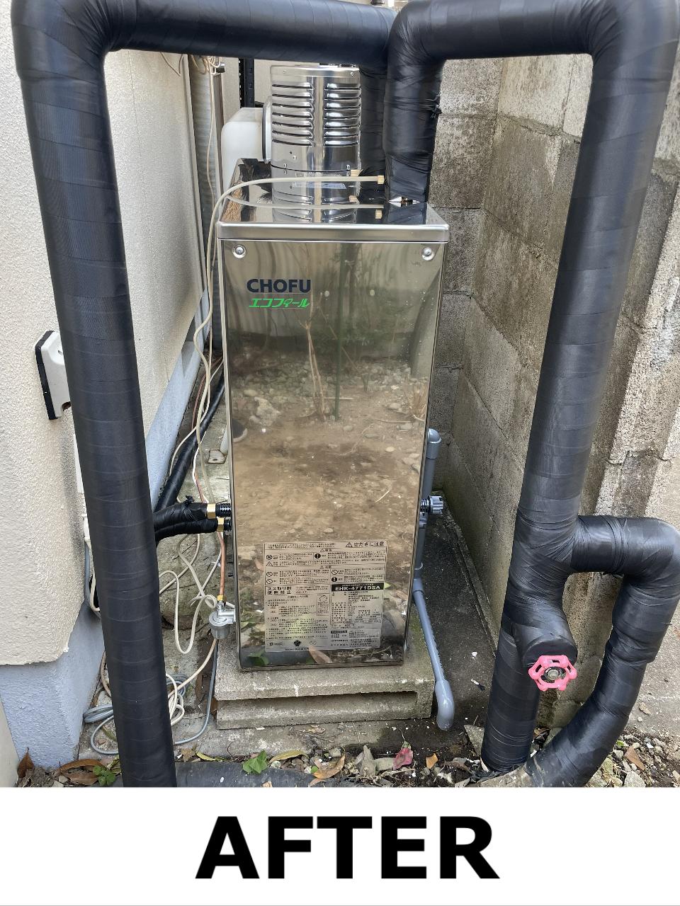 古くなった給湯器と追い炊き配管を新しく交換させていただきました |